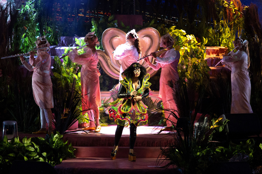 Флора Исландии, с её уникальными видами растений, также сыграла свою роль. Например, в некоторых моментах сцены были украшены изогнутыми структурами, имитирующими растительность и лианы, создавая атмосферу как будто изнутри природы. Эти визуальные элементы усиливали тематику альбома, где Бьорк исследовала гармонию человека с природой, восхищение её формами и внутренней гармонией. Всё это, соединяясь с музыкой и костюмами, создавало магическое и сюрреалистическое ощущение путешествия по самому сердцу Исландии.