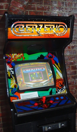 Геймплейный экран игры Berzerk (слева) и её аркадный кабинет (справа)