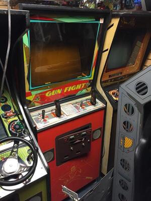 Геймплейный экран игры Gun Fight (слева) и её аркадный кабинет (справа)