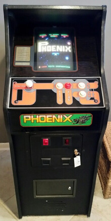 Геймплейный экран игры Phoenix (слева) и её аркадный кабинет (справа)