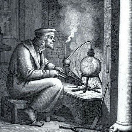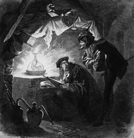 56. Гравюра 19-го века из «Фауста» Гёте (часть 2). Алхимик и гомункул 57. Гравюра 19-го века из «Фауста» Гёте. Вагнер и Мефистофель за созданием Гомулкула
