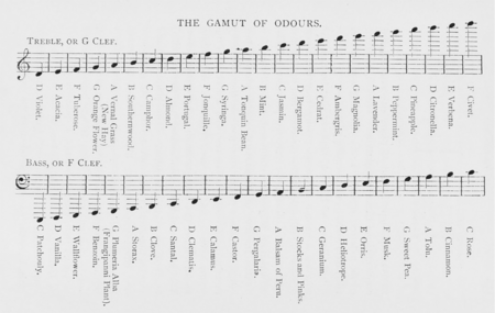110. Septimus Piesse: The Gamut of Odours, from The Art of Perfumery, 1857, 111. Облако слов (Wordle), представляющее относительную частоту использования пахучих веществ текстах футуристов с 1909—1942