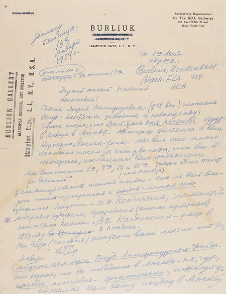 19. Давид Бурлюк к Н. А. Никифорову. Письмо на личном фирменном бланке. Хэмптон, 1958. 28 × 21,5 см 20. Давид Бурлюк к Н. А. Никифорову. Письмо на личном фирменном бланке. Хэмптон, 1959. 28 × 21,5 см