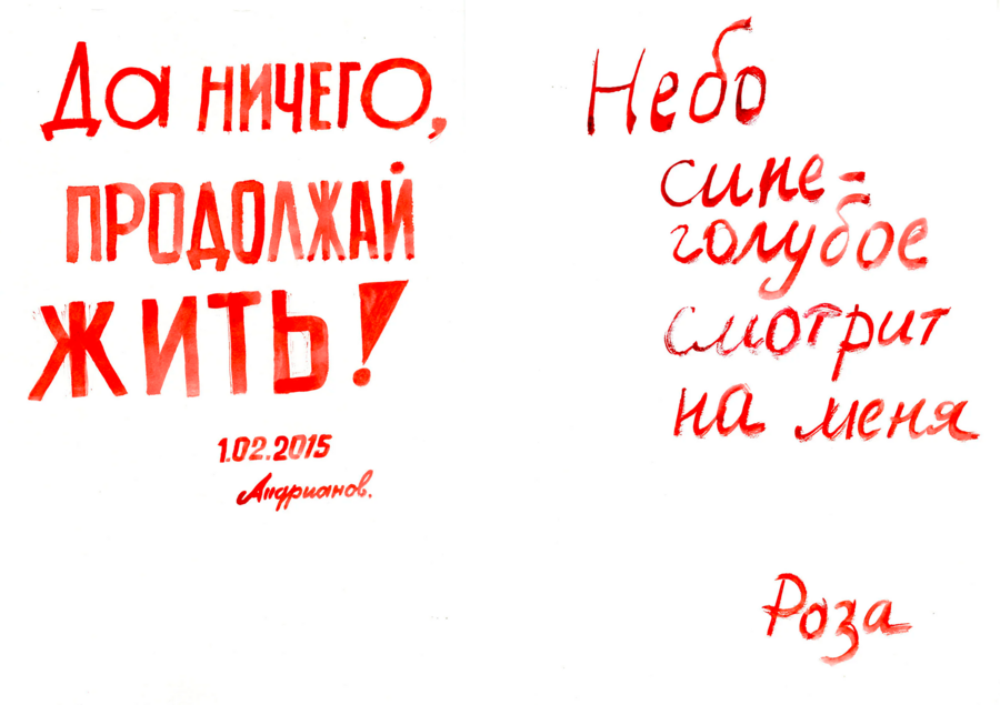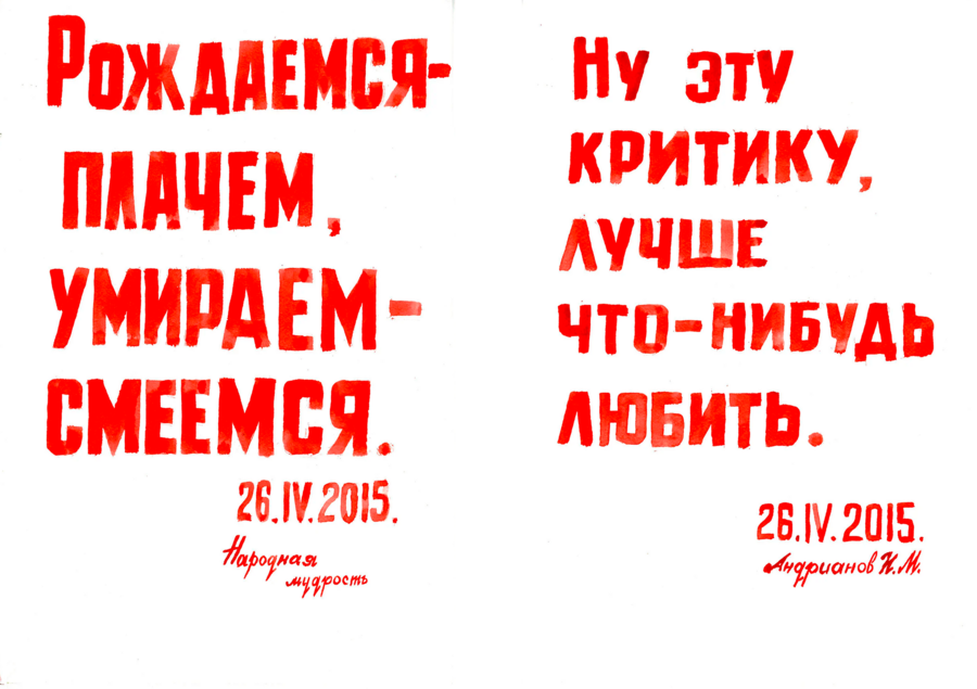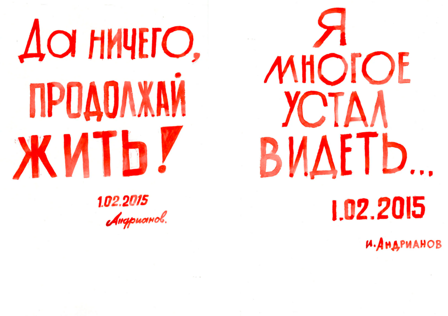 Другой проект, в который входит три серии работ, начался с реакции одного из жителей дома Игоря Андрианова на принесенный каталог с работами Эрика Булатова. Изучив каталог, мужчина вынес вердикт, что сочетание текста и картинки напоминают ему постеры о Советском союзе, но содержание текстов он бы изменил.