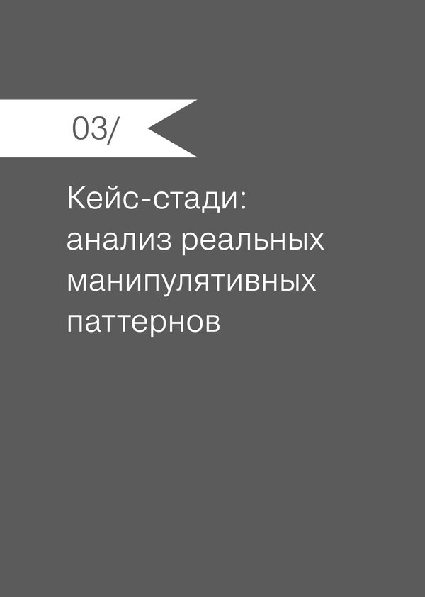3.1. Описание типизации 3.2. Навязчивость (Nagging) 3.3. Препятствия (Obstruction) 3.4. Сокрытие (Sneaking) 3.5. Манипуляция интерфейсом (Interface Interference) 3.6. Принуждение к действию (Forced Action) 3.7. Общий вывод
