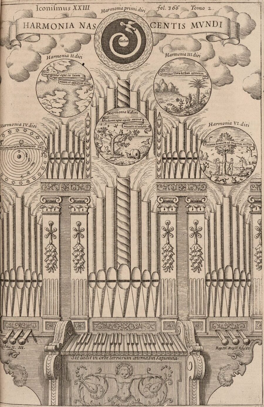В 1650-м году немецкий ученый Атанасиус Кирхер написал музыкальную энциклопедию «Всеобщая музургия» (Musurgia Universalis). В трактате он изображает математические пропорции музыки, гармоничное соотношение зданий, человеческих тел, сотворение мира. Визуализирует Кирхер это все исходя из разных дисциплинарных традиций (37).