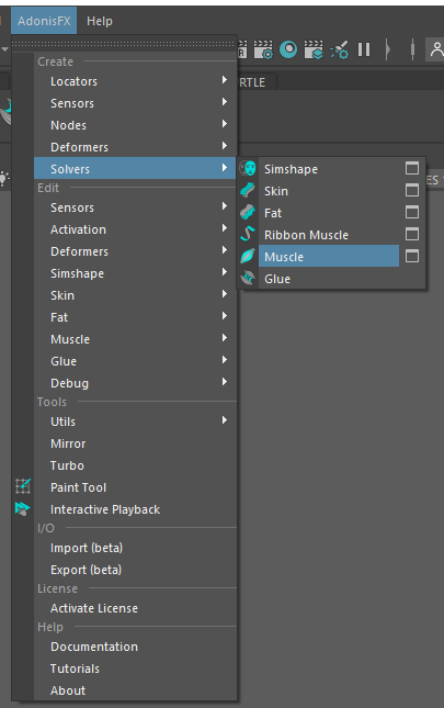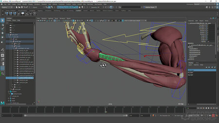 Если в случае с плечевой мышцой привязка шла в два этапа (сначала применяли солвер мышцы, а потом выбрав геометрию скелета, затем саму мышцу назначили таргет), то в этом случае привязка идёт в один шаг: выбираем скелет, выбираем плечевую мышцу, выбираем бицепс плеча и через AdonisFX —> Solvers —> Muscle создаём солвер. На скелет и на плечевую мышцу автоматически назначатся таргеты.
