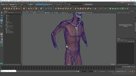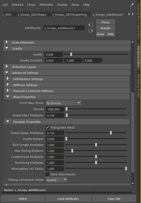 Можно поменять Scale Attributes в случае, если единицы измерения в Maya не соответствуют реальным размерам геометрии. В поле Gravity устанавливаем значение 9,8, соответствующее ускорению свободного падения. В секции Advanced Settings — Mass Properties выбираем в Point Mass Mode режим By Density, который позволяет задать плотность мышечных волокон в поле Density. Параметр Global Mass Multiplier регулирует вес мышцы с учетом гравитации, в нём ставим значение 0,1. В Dynamic Properties обязательно проверьте галочку на опции triangulate mesh — это нужно для увеличения количества констрейнов, т. к. каждый эдж будет посчитан как взаимосвязь, что в свою очередь повышает качество симуляции. Также проверьте, что опция hard attachments отключена, поскольку ее активация делает крепления слишком жесткими, мешая корректному распределению весов. Использование hard attachments оправдано лишь в исключительных случаях, когда требуется сильная фиксация точки к целевой геометрии.