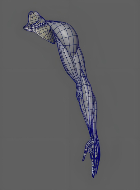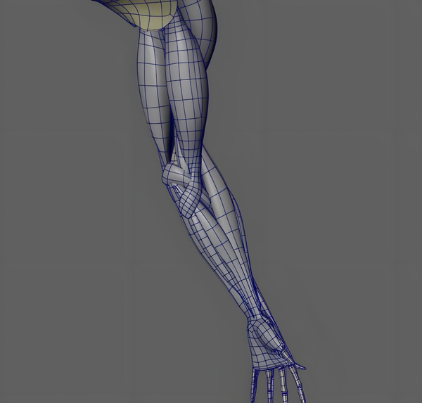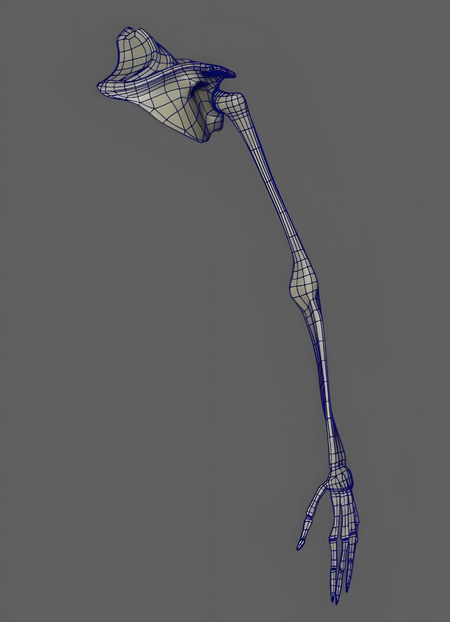 В рамках туториала сконцентрируемся на мускульной и суставной структуре руки, а именно на части грудной клетки, ключице, лопатке, плече, предплечье, запястье и пальцах. Базой будет являться цельная геометрия скелета руки от лопаток до пальцев, а также заранее смоделированные отдельные мэши мышц. Геометрия скелета может состоять и из составных частей, однако позже это может привести к сложностям из-за возникающих коллизий мэшей.
