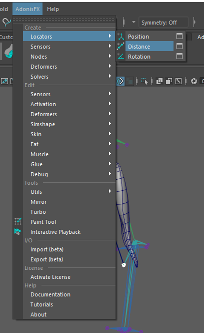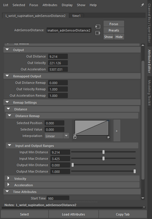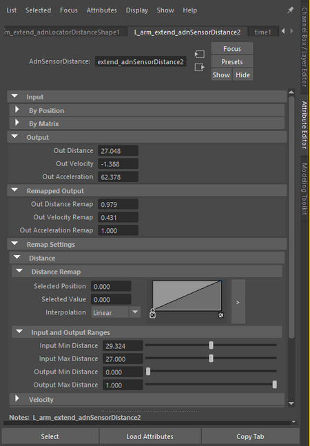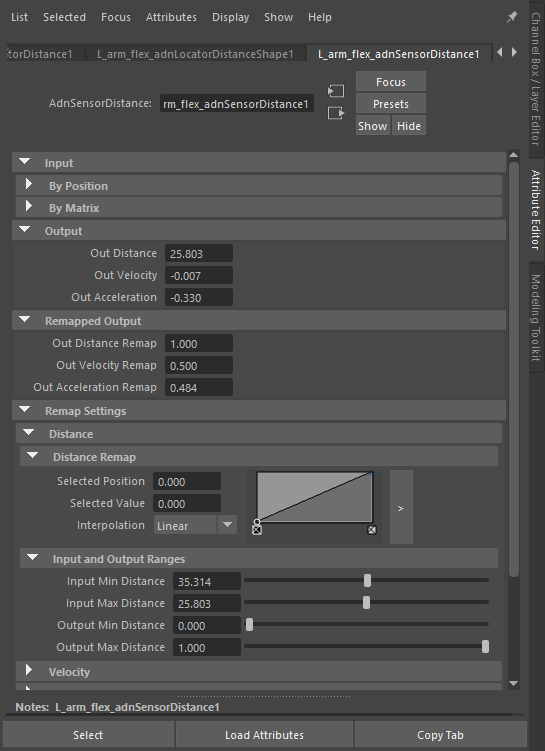 Для начала создаём локатор через AdonisFX —> Create —> Locator —> Distance между двумя передними джойнтами у плеча и локтя, которые предварительно создавались для размещения локаторов Adonis. Называем этот локатор L_arm_flex_adnLocatorDistance (добавляем префикс в самом начале). Далее выбираем этот локатор, и создаём на нём сенсор также через AdonisFX —> Create —> Sensor —> Distance. В настройках атрибутов также меняем название, и после этого там же в окне Remap Distance в Output проверяем текущее значение дистанции. В Input Min Distance будет автоматически вписано максимальное значение этой дистанции, а в Input Max Distance нужно будет вручную вписать минимальное значение, которое можно проверить в Output’е, прокручивая анимацию в поисках минимального значения расстояния. Теперь можно увидеть, как меняется цвет этого локатора в зависимости от значения, которое он принимает, и соответственно в зависимости от положения плеча и локтя относительно друг друга.