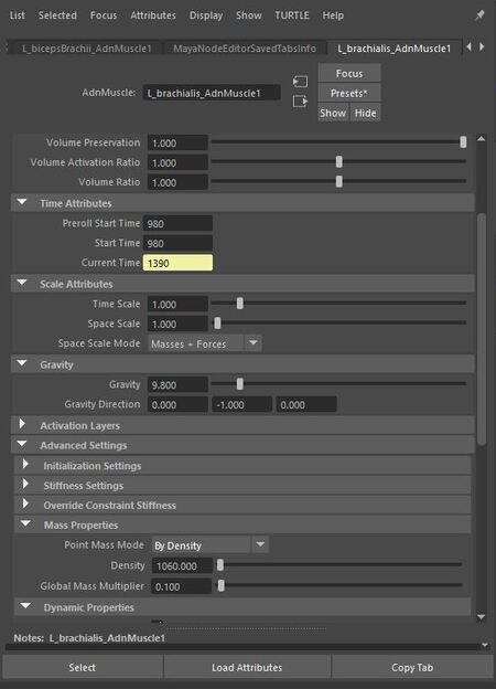 Применяем солвер мышц на геометрию трицепса и ставим базовые параметры в настройках солвера: Gravity на 9,8, Global Mass Multiplier на 0,1, Max Sliding Distance на 1. Для удобства можно сохранить эти настройки в отдельный пресет через Presets —>Save AdnMuscle Preset, я присвою этому пресету название basic_parameters.