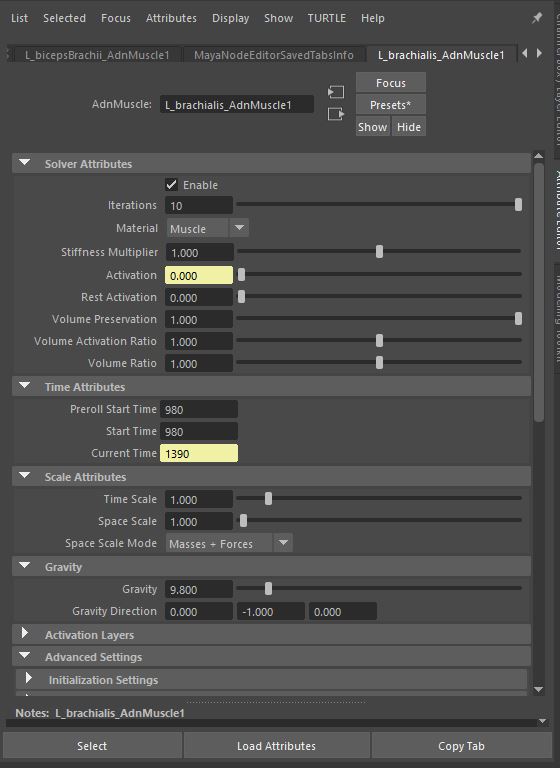 Настраиваем солверы мышц и распределяем веса влияний на каждый из обозначенных атрибутов покаа без создания локаторов-сенсоров и подключения мышц к ним. Все оставшиеся сенсоры будут созданы позже.