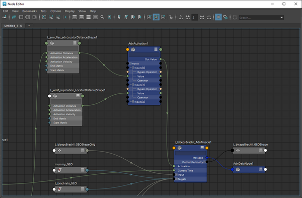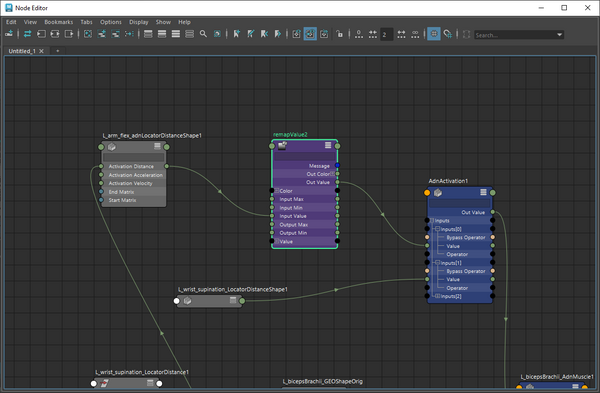 Нода AdnActivation и шейп локатора супинации в Node Editor
