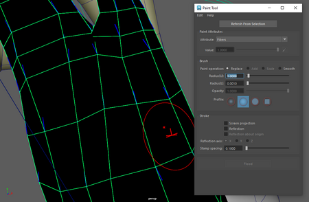 Переключимся на атрибут Fibers. В настройках солвера мышцы в разделе Debug можно установить масштаб (например, 5) этих волокон и проверить их направление. Они должны стремиться совпадать с топологией мышцы и идти вдоль неё, кистью можно при необходимости «расчёсывать» их, исправляя их направление для обеспечения корректной симуляции.