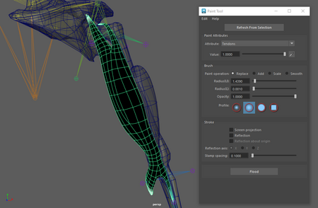 Затем переключимся на атрибут Tendons, где с весом 1 отрисовываем сухожилия, отмечая их начало и концы. Стоит отметить, что распределение весов сухожилий не влияет напрямую на их прикрепление; они используются в дальнейшем для создания волокон на мышце в атрибуте Fibers.