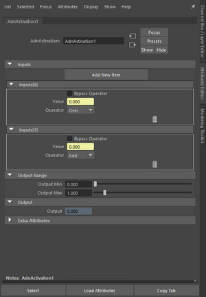 Создаём ноду AdnActivation. В каждый из его входов input в атрибуты value подключаем атрибуты Activation Distance из шейпов локаторов сгибания локтя и супинации запястья соответственно. Внутри самой ноды активации можно выбрать операцию, проводимую над входящими значениями: в нашем случае для input 0 оставляем команду Over, а для input 1 ставим команду Add, чтобы две активации работали вместе.