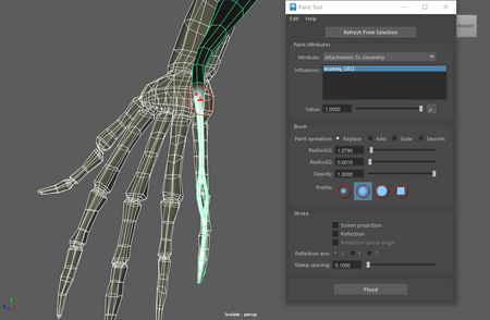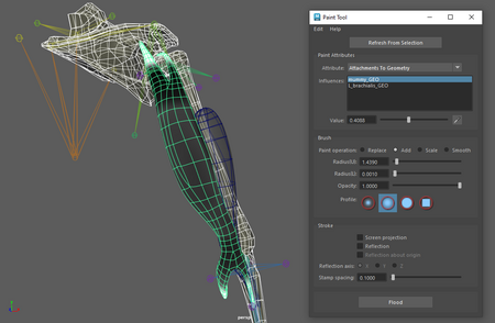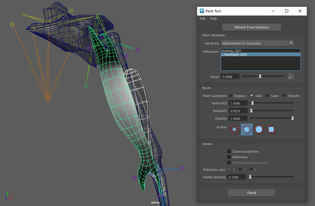 В первую очередь распределяем веса влияний по атрибуту Attachments To Geometry. В реальном теле внешняя фасция сжимает мышцы к кости. Для эмуляции этого устанавливаем базовое прикрепление 0.1 с помощью Flood. Если нежелательно сильное сжатие мышц, можно использовать меньшее значение, например 0.01. После этого мы распределяем вес 1 на тех местах мышцы, где она крепится к кости. Далее под брюшком мышцы, где она соприкасается с костью, устанавливаем вес 0.5, чтобы имитировать соединительную ткань между мышцей и костью. Теперь можно проверить, как мышца ведет себя вместе с костью.