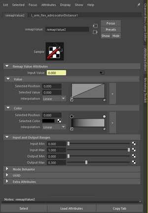 Для этого создадим ноду remapValue, в его вход input value подключаем выход activatio distance из шейпа локатора сгибания, и внутри самой ноды меняем значение output max на меньшее. Я в своём случае меняю на 0,3. Теперь бицепс плеча активируется на сгибании частично, а до своего максимального сокращения доходит при вращении запястья наружу.