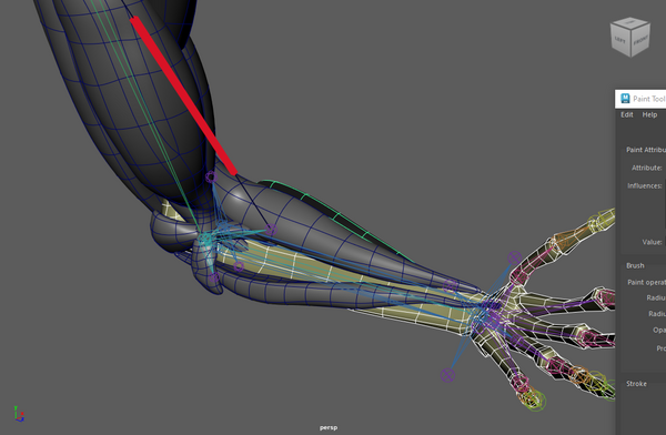 Ещё одно изменение — это добавление длинной ладонной мышцы в список влияний на бицепс, так как одна из связок бицепса плеча крепится к этой мышце. Для этого так же используем команду Add Target, и после этого добавляем через Paint Tool соответствующие веса для нового влияния.
