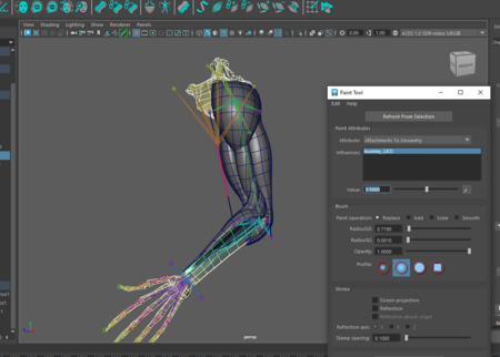 После прикрепления мышцы к скелету выбираем мышцу и инструмент «Paint Tool». Рекомендуется отключить коррекцию цвета и включить рентген для лучшей видимости. Все значения распределяемого веса будут указаны приблизительные, отклонения от этих чисел допустимы. Во всех случаях начального распределения веса я использую режим Replace, изредка прибегая к режиму Add во время финальных доработок весов.
