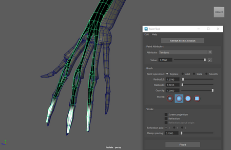 Переключившись на атрибут Tendons, закрашиваем области связок, после чего в атрибуте Fibers выравниваем направление волокон.