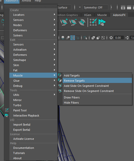 Создаём таргет, выбрав единую мышцу сгибателей пальцев, выбрав длинную ладонную мышцу и нажав Adonis FX —> Muscle —> Add Targets. По сути ладонная мышца практически полностью лежит на сгибателях пальцев и соответственно следует всем деформациям той единой мышцы. В свою очередь это означает, что из влияний на эту мышцу можно удалить геометрию скелета. Для этого выбираем геометрию скелета, выбираем длинную ладонную мышцу и используем операцию Remove Targets через Adonis FX —> Muscle —> Remove Targets.