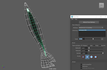 Выбрав бицепс плеча и открыв Paint Tool, можно увидеть, что в каждом атрибуте теперь есть по два влияния, каждому из которых нужно распределить веса. В атрибуте Attachments On Geometry мы распределяем веса влияния скелета, нарисовав значение веса 1 на связках и значение 0,1 на областях мышцы, которые не соприкасаются с областью контакта с плечевой мышцей. В это же время влиянию плечевой мышцы присваиваем значение 0,1 в оставшейся незакрашенной области бицепса плеча, после чего на месте соприкосновения с плечевой мышцой под брюшком распределяем вес 0,5.