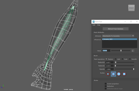 Наконец, связываем сенсор локатора сгибания и бицепс плеча через Adonis Connection Editor таким же образом, как и связывали плечевую мышцу: соединяем атрибут activationDistance сенсора с атрибутом activation мышцы. После этого можно так же возвращаться обратно к рисованию весов на атрибуте Attachment To Geometry для корректировки весов.
