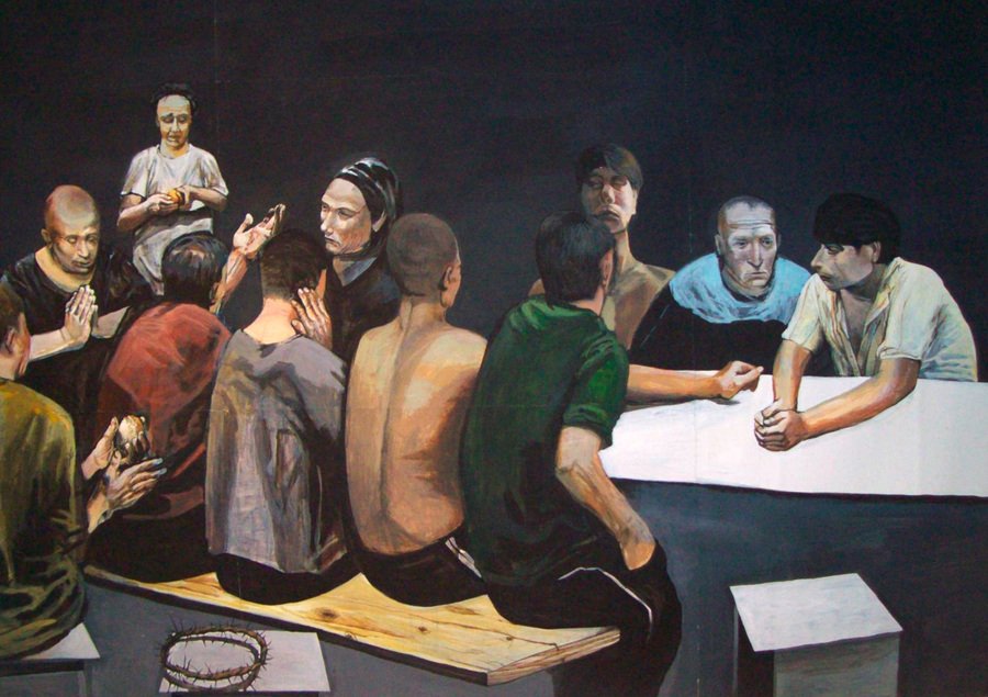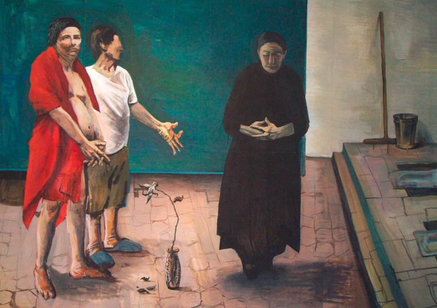 Первая большая живописная серия Гаршина получила название «Пределы адекватности». Сам автор говорит, что в работах исследует «границы человеческой адекватности через призму библейских образов. Это интерпретация новозаветных событий в контексте сумасшедшего дома, существующая в условно поврежденном сознании»[11]. Проведя некоторое время в психиатрической больнице, художник обнаружил, что закрытое изолирующее пространство учреждений становится полем для сцен, знакомых нам из религиозных текстов и истории изобразительных искусств. Персонажи, ритуалы, процедуры, встреченные в лечебнице, перевоплощаются в новом образе, размывая границу между рутиной, обыденностью и «вечными» сюжетами.