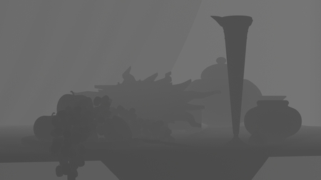 Демонстрация первого технического кадра секвенции, когда точность визуализации минимальная. Погрешность рендера — один из объектов и вовсе не отображается, стекло выдает шум.