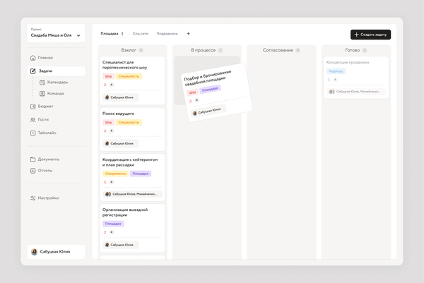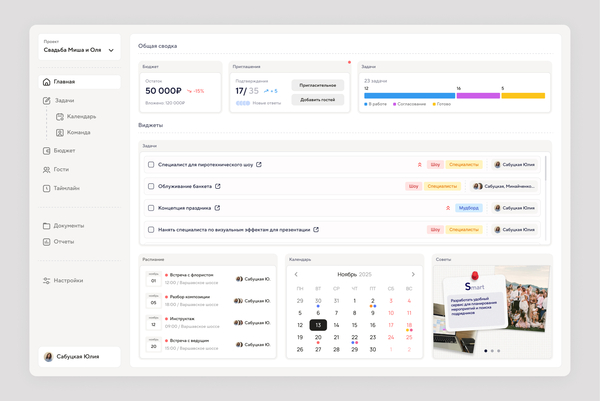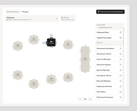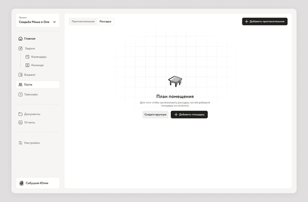 Знакомые функции для организатора, дополнены нишевыми разделами, такими как: отслеживание пригласительных и кастомная рассадка гостей на площадки для более камерных мероприятий.