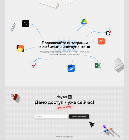Для возможной рекламы сервиса был создан лендинг, который знакомит потенциальных пользователей с основными функциями Dayset. Главный призв к действию, это получить доступ к демо варианту сервиса.