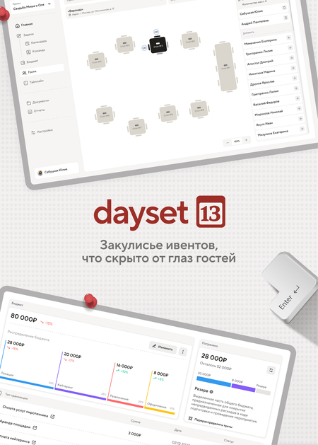 Dayset создан не просто для привычной организации событий, но и для помощи в освоении эффективных подходов к планированию, поиску баланса между креативными идеями и рутинными задачами. Онбординги, встроенные виджеты и востребованные функции делают этот продукт полезным и удобным как в реализации камерных мероприятий, таки в планировании масштабных ивентов.