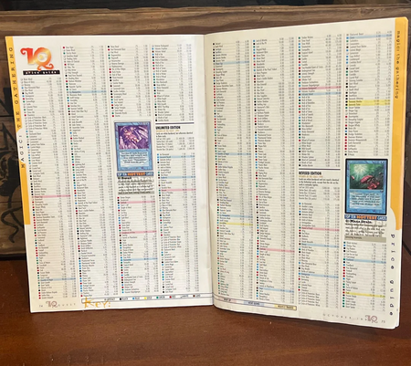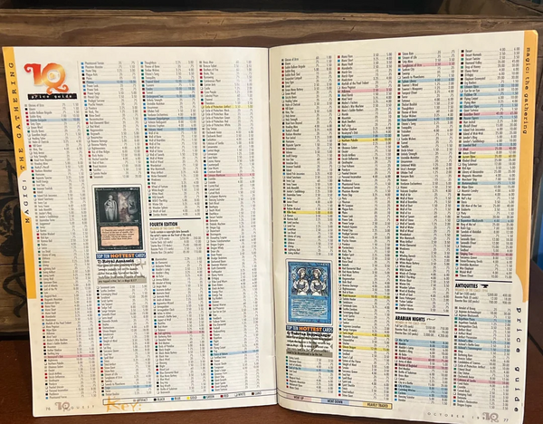 Ценовые справочники Scrye и InQuest. Эти журналы (Scrye стартовал в 1994 году) собирали данные о ценах на карты, обзванивая сотни магазинов по всей стране, и публиковали усреднённые таблицы. Это были первые «авторитетные источники» — если карта стоила ^$100 по Scrye, это означало, что она действительно ценная, независимо от мнения отдельного игрока или локального сообщества