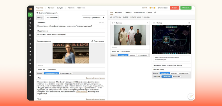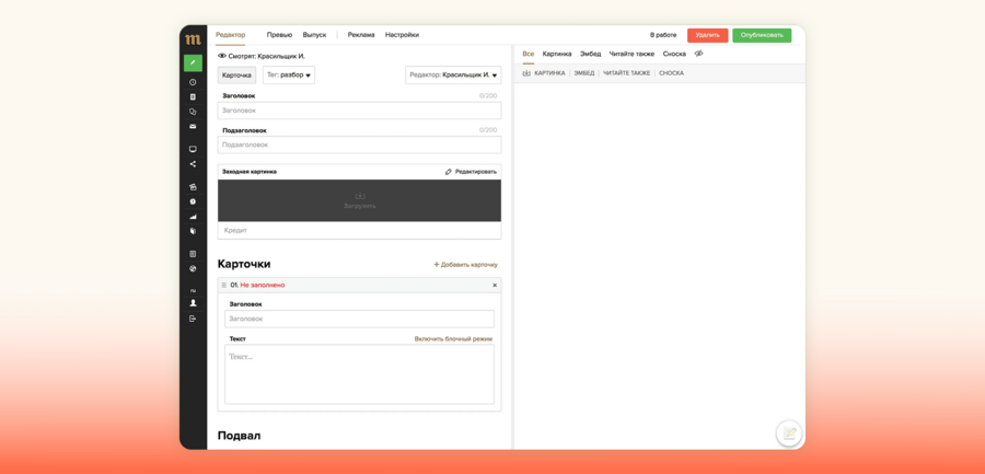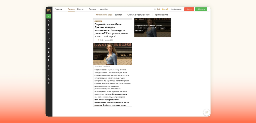 Разработчики «Медузы» подробно описали работу во внутренней системе «Монитор» [17]. Он отображает не только отдельные тексты, но и весь поток выпусков за последние 24 часа: на одном экране видны материалы в работе, уже опубликованные и запланированные. Отдельный интерфейс предусмотрен для разных форматов выпусков. Для написания статей используется блочная структура с текстовым редактором. Для создания карточек, тестов и новостей применяются формы из полей и место для обложки. На этапе создания материала экран разделяется для удобной работы над текстом (слева) и медиаобъектами (справа). Даже полностью подготовленный текст не попадает к читателю, пока выпускающий редактор не включит его в выпуск и не определит видимость на главной странице или в рассылке, поэтому окончательное решение о попадании материала в ленту принимает человек.