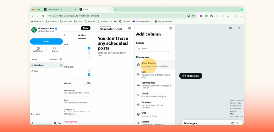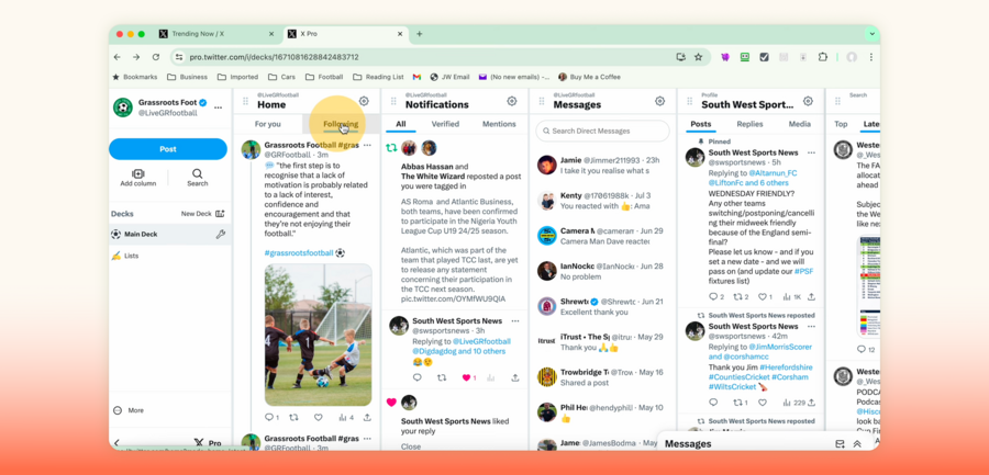 TweetDeck (или X Pro) — инструмент для работы с X (Twitter), который превращает одну ленту в многоколоночный интерфейс и позволяет настраивать несколько пространств (decks) под разные сценарии: общий поток, списки, отдельные аккаунты или поиск по темам. Пользователь может добавлять колонки для таймлайна, списков, результатов поиска, упоминаний, личных сообщений или отдельных профилей, менять их порядок и ширину, настраивать внешний вид (цвет интерфейса, размер текста, размер превью медиа) и быстро удалять или очищать колонки при необходимости. TweetDeck помогает наблюдать и фильтровать поток, но не фиксирует, какие твиты уже использованы в работе автора, и не предоставляет встроенных инструментов для превращения отобранного в структурированную подборку.