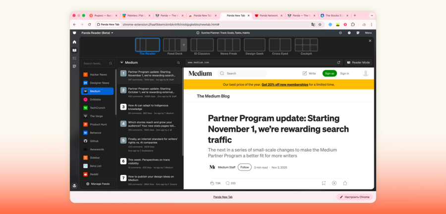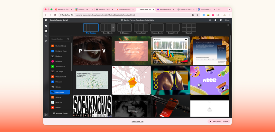 Panda — расширение, которое превращает новую вкладку браузера в удобный RSS-ридер. Пользователь сам выбирает источники, которые хочет отслеживать, определяет их порядок и может организовать из них группу (bundle). Однако собирать отдельные новости в подборки нельзя. Интерфейс поддерживает несколько режимов отображения (разделение экрана на колонны и карточки), быстрые заметки и закладки. Для текстовых источников (например, Medium) предусмотрен режим чтения и предпросмотра в оригинальной верстке. Для визуальных материалов (например, проекты с Dribble) отображаются только карточки-обложки, по клику на которые можно перейти на сайт.