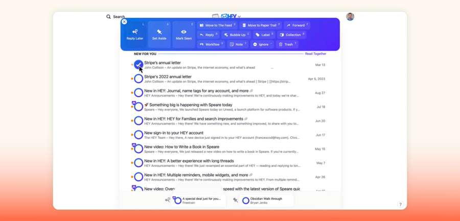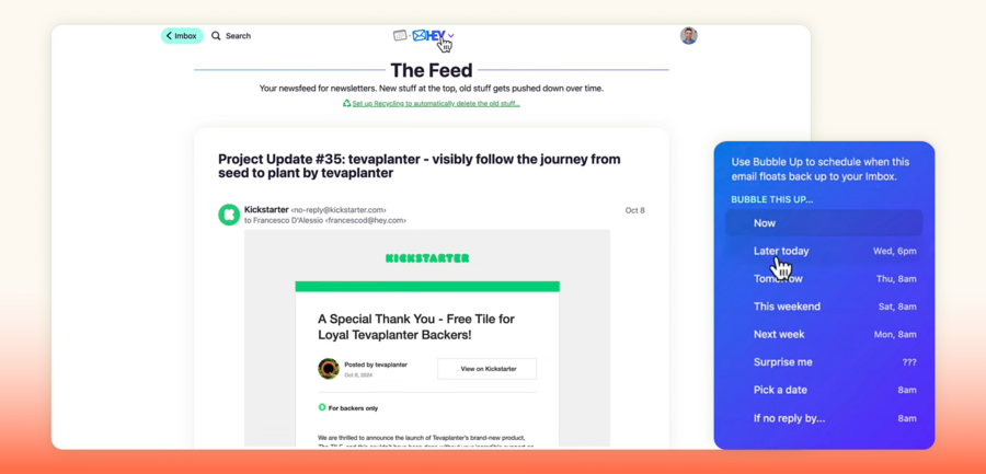 Hey — почтовый сервис, который переосмысляет привычную модель и работает не с папками, а с режимами внимания пользователя. Вместо классических «Входящих» и набора папок он предлагает три основные раздела: Imbox для писем от важных и проверенных контактов, Feed для рассылок, которые удобно просматривать как ленту, и Paper Trail для чеков, счетов и других служебных уведомлений. Такой подход сразу разделяет письма по способу потребления, а не по формальным меткам. Дальнейшая работа строится вокруг управления фокусом. Важные письма для ответа и закреплённые сообщения собираются в отдельные стопки, к ним можно вернуться через режим Reply Later. Режим Bubble Up позволяет показать письмо в момент времени, который устанавливает пользователь. Режим Focus Mode помогает обрабатывать письма пакетами, а инструмент Clips сохраняет фрагменты текста из разных писем в пользовательские подборки.