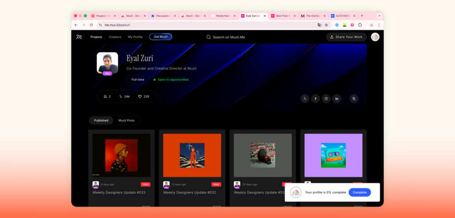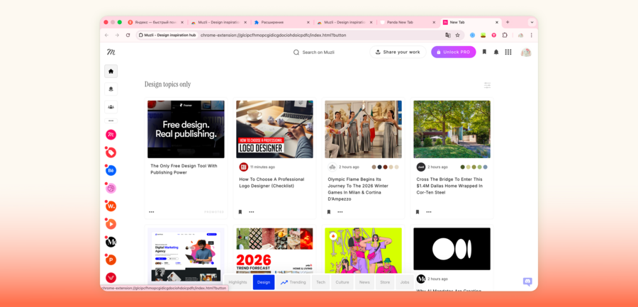 Muzli — расширение, которое также заменяет новую вкладку, но делает акцент на визуальной ленте для дизайнеров. В основе интерфейса плитка из обложек проектов, собранных из сотен профильных источников (Dribbble, Awwwards, Designspiration и др.). Пользователь может настраивать список источников (более 160 вариантов) и перемещаться между разделами в нижнем меню. Карточки текстовых источников и проектов выглядят почти одинаково — у них нет системы превью и режима чтения. Отдельно у Muzli есть среда для авторов, где можно публиковать свои проекты, часто с большим количеством визуальных материалов. Также редакция сервиса регулярно создает свои подборки Muzli Picks для дизайнерского вдохновения, превращая платформу в медиа.