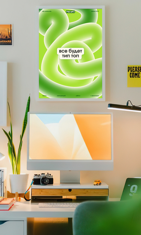 Основным визуальным приемом стала сложная, псевдо объемная линия с градиентом. В зависимости от контекста зритель может интерпретировать ее по-разному. С ее помощью можно показать запутанность, сложность жизни фрилансера. Сложная линия, в то же время, может оказывать расслабляющее действие, помогать человеку отвлечься и сделать перерыв. Кроме того, линия может символизировать связи внутри сообщества, подчеркивая дружелюбность и открытость Ресурза.