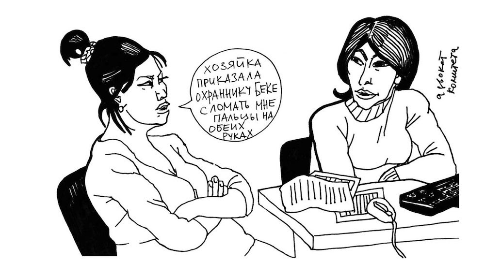 Ломаско В. Работа из графического репортажа «Рабы из московского магазина „Продукты“» [изображение] // Сайт «Такие дела». (URL: https://takiedela.ru/wp-content/uploads/2018/04/Viktoriya-Lomasko-Rabi-iz-moskovskogo-magazinu-Produkti-2012_II.jpg). Просмотрено: 12.11.2025.