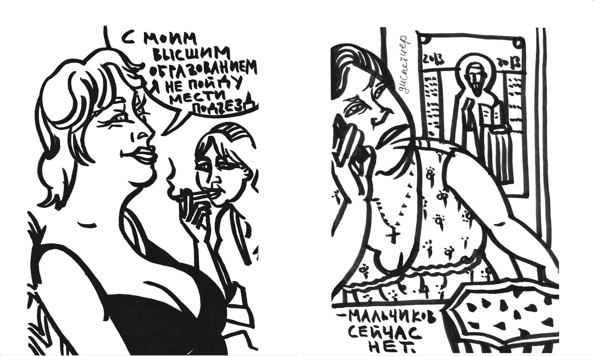 Ломаско В. Работа из графического репортажа «Девочки» [изображение] // Zima Magazine. (URL: https://zimamagazine.com/wp-content/webp-express/webp-images/doc-root/wp-content/uploads/2018/03/lomasko-other-russias.png.webp). Просмотрено: 12.11.2025.