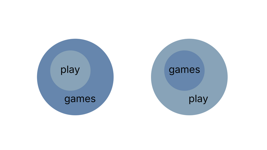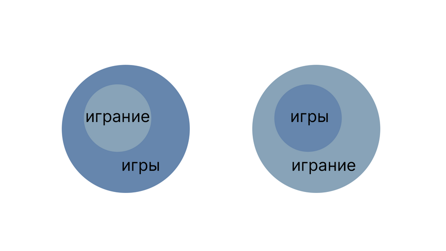 «Оказывается, что играние и игры находятся в удивительно сложных отношениях. Играние — это одновременно и более широкое, и более узкое понятие, чем „игра“, в зависимости от того, как оно сформулировано. В одном смысле „играние“ — более широкое понятие, включающее „игру“ как подмножество. В другом же смысле верно обратное: „игра“ — более широкое понятие, включающее в себя „играние“.