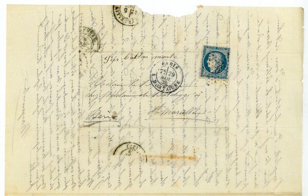 14. [Почта на воздушном шаре]. Письмо с подписью («Маргарита»), написанное парижанкой и адресованное её матери, бежавшей в Сен-Марселлен. Париж, 29 ноября 1870 г. Формат неизвестен