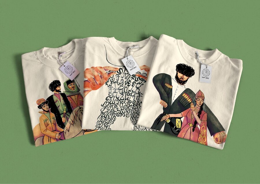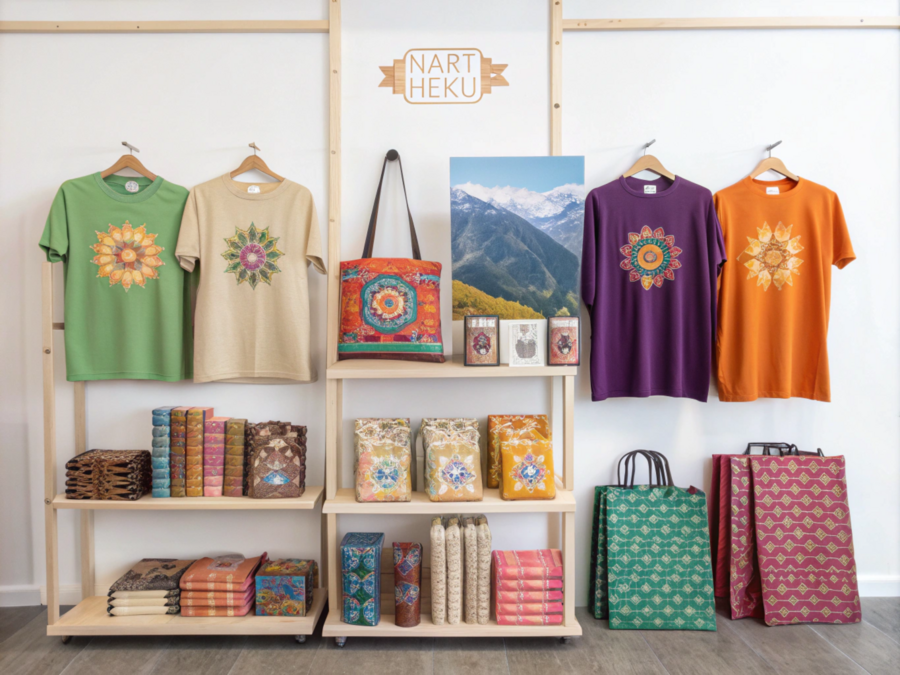 imagines prompt: Create a product store of the Circassian culture festival «NART HEKU — Circassian products». Let it have T-shirts, covers, bags in different colors with ornaments, mountains, different ethnic objects, sun, wood. Colors: beige, light green, orange, purple, pink, gold. Let the background be white, non-itral.