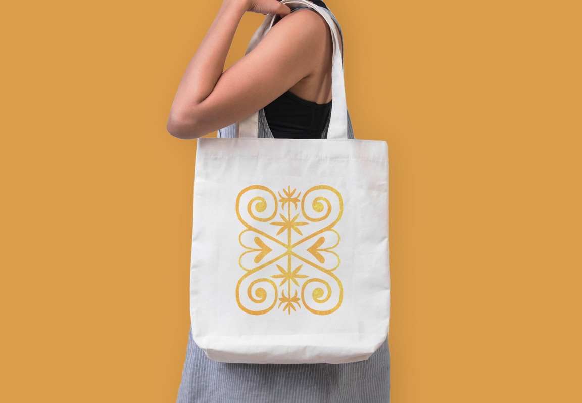 imagines prompt: Create a mocap of a bag for the product store of the Circassian culture festival «NART HEKU — Circassian products». Let it have ornaments, mountains, different ethnic objects, sun, wood. Colors: beige, light green, orange, purple, pink, gold. Let the background be white, non-itral.
