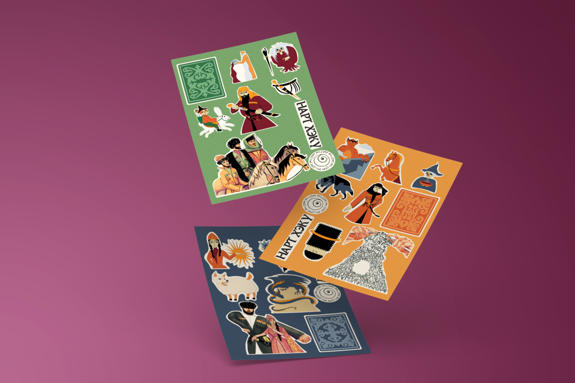 imagines prompt: Create a mocap with stickers for the product store of the Circassian culture festival «NART HEKU — Circassian products». Let the stickers consist of ornaments, mountains, different ethnic objects, sun, tree. Colors: beige, light green, orange, purple, pink, gold. Let the background be white, non-itral.