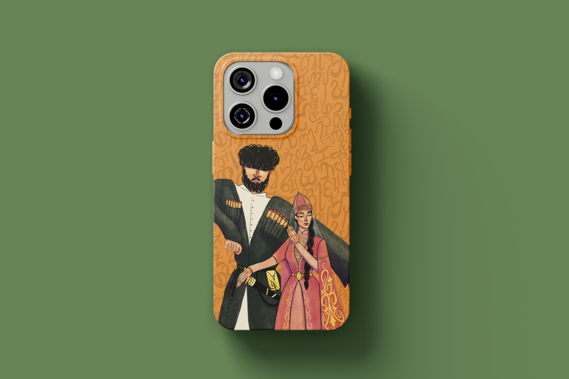 imagines prompt: Create a mocap with an iPhone cases for the product store of the Circassian culture festival «NART HEKU — Circassian products». Let it have ornaments, mountains, different ethnic objects, sun, wood. Colors: beige, light green, orange, purple, pink, gold. Let the background be white, non-itral.