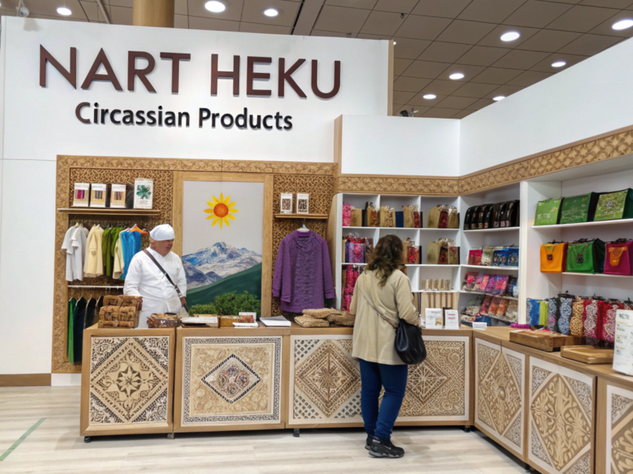 imagines prompt: A minimalist poster with the text «NART HEKU — Circassian Products». There is a beige background with a light green pattern. The pattern consists of abstract shapes, possibly mountains. The text is written in orange and purple. There are also ethnic accessories displayed, such as a pink and gold headpiece. Below the accessories, there are books with beige covers and purple text.