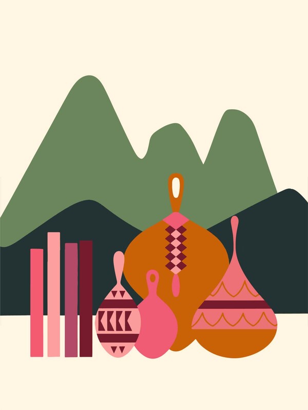 imagines prompt: Generate a mockup of A minimalist poster with the text «NART HEKU — Circassian Products». There is a beige background with a light green pattern. The pattern consists of abstract shapes, possibly mountains. The text is written in orange and purple. There are also ethnic accessories displayed, such as a pink and gold headpiece. Below the accessories, there are books with beige covers and purple text.